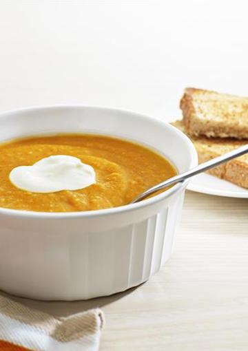 Spicy pumpkin soup A warming twist on an old favourite. Why not make a pot of pumpkin soup and freeze the leftovers for a healthy fast food option for one of those cold tired winter nights. Soup Print this recipe Details Serves: Serves 4Number of ingredients: 13 IngredientsTo prep: 5 Minutes PrepTo cook: 20 Minutes CookDifficulty: Easy Nutrition per servingEnergy : 1457kJProtein: 12.7gFat (total) : 4.5g- Saturated Fat: 0.7gCarbohydrate (total): 58.1gFibre: 10.6gSodium: 431mg Ingredients 1 teaspoon canola oil 1 onion, chopped 3 clove garlic. chopped 1 tablespoons ground cumin 2 tablespoons curry powder 3 cups pumpkin, peeled and chopped into 2cm cubes 1 small sweet potatoes, peeled and chopped into 2cm cubes 2 medium potatoes, peeled and chopped into 2cm cubes 1 apple, peeled, cored and quartered 1 reduced-salt vegetable stock cube (or 1 teaspoon powder) 1 litre water 4 tablespoons low-fat natural or Greek yoghurt, to serve 4 slices of wholemeal or multigrain bread, to serve Method Heat oil in a large pot and fry onion, garlic, cumin and curry powder for 2 minutes. Add the rest of the ingredients and simmer for 10 minutes or until the vegetables are just soft. Use a stick blender, normal blender or food processor to blitz the soup till smooth. Add more water if you prefer a runnier soup. Serve with a slice of toast and a spoonful of yoghurt.