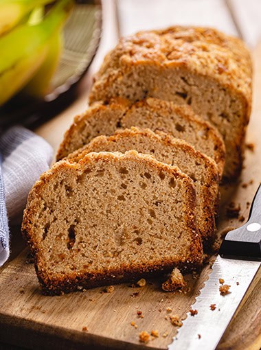 Low GI banana bread Breakfast Print this recipe Details Serves: 10Number of ingredients: 14To prep: 15 minutesTo cook: 60 minutesDifficulty: Easy Nutrition per servingEnergy: 1084Calories: 259Protein: 6.5gFat: 11.6gSaturated fat: 1.8gCarbohydrates: 28.2gFibre: 3gSodium: 230mgPotassium: 287mg Ingredients 1 cup wholemeal plain flour 1 teaspoon bicarbonate of soda ½ teaspoon baking powder ¼ teaspoon salt ½ teaspoon ground cinnamon 1 cup rolled oats ½ cup almond meal 3 bananas large, ripe, mashed ⅓ cup extra virgin olive oil ⅓ cup low GI honey 2 eggs lightly beaten ¼ cup milk of your choice 1 teaspoon vanilla essence ½ cup reduced fat Greek yoghurt Method Preheat oven to 175°C. Line a loaf tin with baking paper. Lightly grease over the top with a pastry brush and olive oil. Dry ingredients: In a medium mixing bowl, whisk together the wholemeal flour, almond meal, oats, baking soda, baking powder, cinnamon, and salt. Wet ingredients: In a large, separate bowl, mash the banana then use a whisk to combine the honey, olive oil, milk, yoghurt, vanilla and eggs. Add the dry ingredients to the wet mixture. Using a spatula, gently stir the mixture until thoroughly combined. Pour the batter into the prepared loaf pan and spread evenly. Sprinkle the batter with cinnamon or extra oats. Bake for approximately 30 minutes then loosely cover with foil (covering with foil will prevent the loaf from over-browning). Bake for a further 30 minutes or until cooked in the middle (use a skewer to test the middle of the bread. If the skewer comes out clean then its cooked).