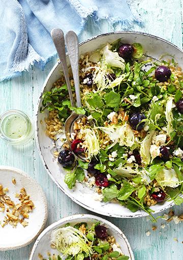 Barley, cherry & fetta salad What to bring when you’re told not to bring a thing? Try this beautiful fetta salad that includes Brussels sprouts and cherries - the perfect festive dish to take along to Christmas gatherings this summer. Salad Print this recipe Details Serves: Serves 2Number of ingredients: 8 IngredientsTo prep: 5 Minutes PrepTo cook: 25 Minutes CookDifficulty: Medium Nutrition per servingEnergy : 1278kJProtein: 9.4gFat (total) : 16.7g- Saturated Fat : 3.5gCarbohydrate (total): 26.1gFibre: 7.1gSodium: 178mg Ingredients 1/3 cup (65g) pearl barley, rinsed 100g Brussel sprouts, trimmed, sliced very thinly (see tip) 1 ½ cups (25g) firmly packed trimmed watercress sprigs 75g fresh or frozen cherries, pitted 1 ½ tablespoons coarsely chopped walnuts, roasted 1 tablespoon olive oil 2 tablespoons lemon juice 30g reduced-fat fetta, crumbled Method Cook barley in medium saucepan of boiling water for 25mins or until tender. Drain, rinse under cold water, drain well. Transfer to a large bowl. Add sprouts, watercress, cherries, nuts and combined oil and juice to barley; season. Transfer to a serving plate; top with cheese.