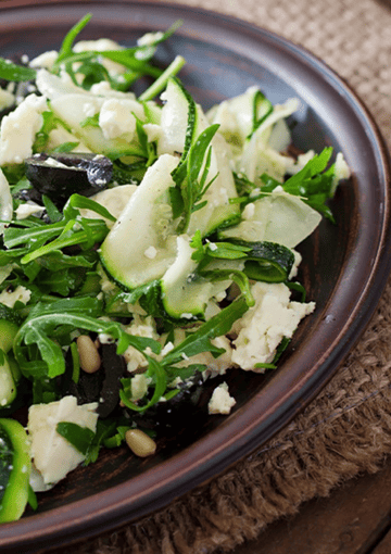 Zucchini, feta and pine nut salad This refreshing zucchini, feta and pine nut salad is perfect for a summer barbeque or weekend family gathering. Drizzle with olive oil, garnish with rocket and enjoy! Print this recipe Details To prep: 5 minutesTo cook: 10 minutesServes: 4 Nutrition per servingEnergy: 2039kJProtein: 9.80gTotal fat: 45.54gSaturated fat: 6.98gCarbohydrates: 8.02gDietary fiber: 6.06gSodium: 559.60mg Ingredients 5 large zucchinis 1/2 cup toasted pine nuts 50g crumbled feta cheese Sprinkle of chives 1/2 teaspoon salt 1/4 teaspoon pepper 1 tablespoon extra virgin olive oil 2 cups rocket 6 Kalamata olives quartered (optional) Method Shave zucchini into thin strips using a vegetable peeler and lightly grill (you can also use a sandwich press). Cook for about a minute on each side and set aside to cool. In a non-stick fry pan, toast the pine nuts until lightly golden. Toss shaved zucchini, chives, pine nuts, cheese, olives, salt and pepper together. Drizzle olive oil, garnish with rocket and enjoy!